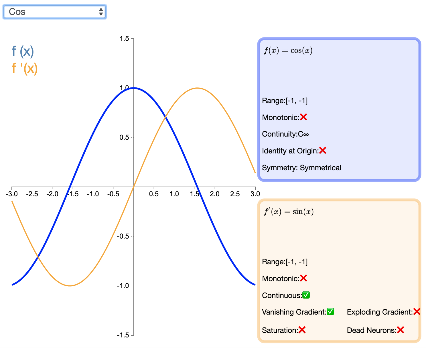 如同正弦函数,余弦激活函数(Cos/Cosine)为神经网络引入了周期性。它的值域为 [-1,1],且导数处处连续。和 Sinusoid 函数不同,余弦函数为不以零点对称的偶函数。