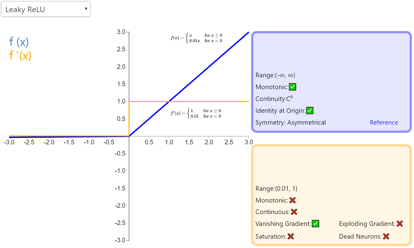 经典(以及广泛使用的)ReLU 激活函数的变体,带泄露修正线性单元(Leaky ReLU)的输出对负值输入有很小的坡度。由于导数总是不为零,这能减少静默神经元的出现,允许基于梯度的学习(虽然会很慢)。