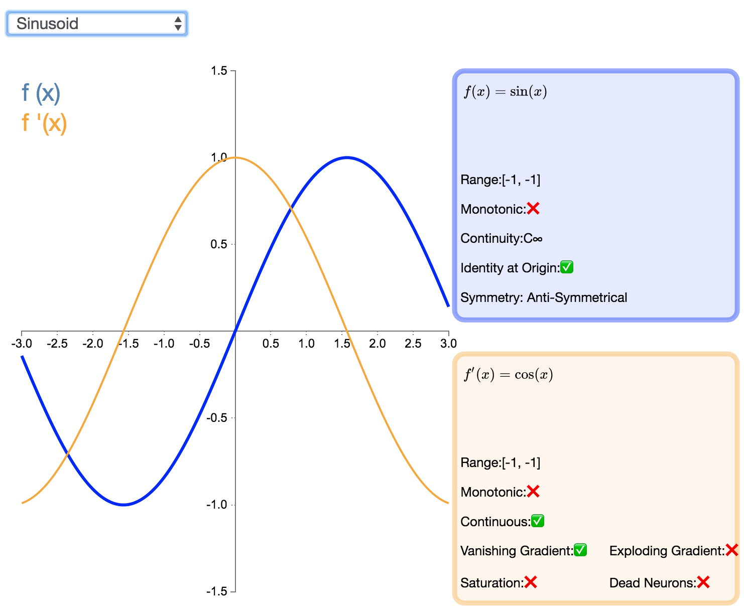 如同余弦函数,Sinusoid(或简单正弦函数)激活函数为神经网络引入了周期性。该函数的值域为 [-1,1],且导数处处连续。此外,Sinusoid 激活函数为零点对称的奇函数。