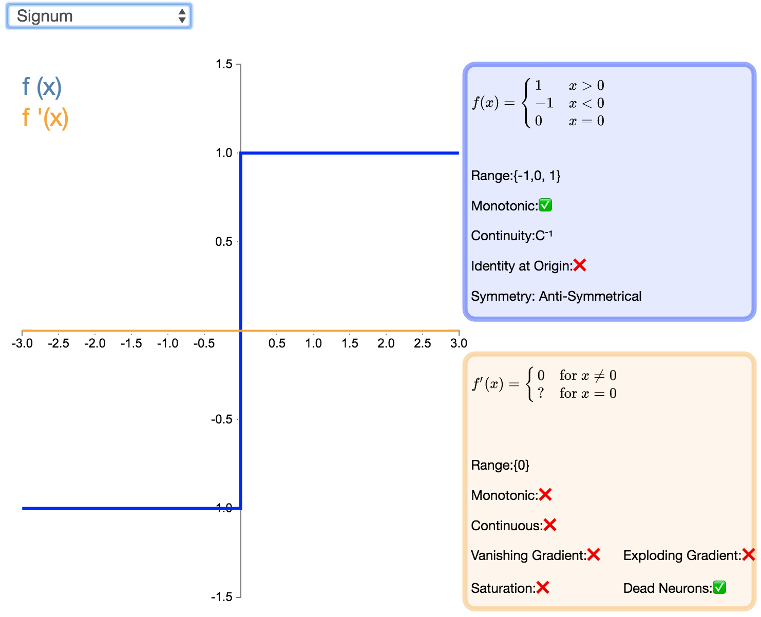 激活函数 Signum(或者简写为 Sign)是二值阶跃激活函数的扩展版本。它的值域为 [-1,1],原点值是 0。尽管缺少阶跃函数的生物动机,Signum 依然是反对称的,这对激活函数来说是一个有利的特征。