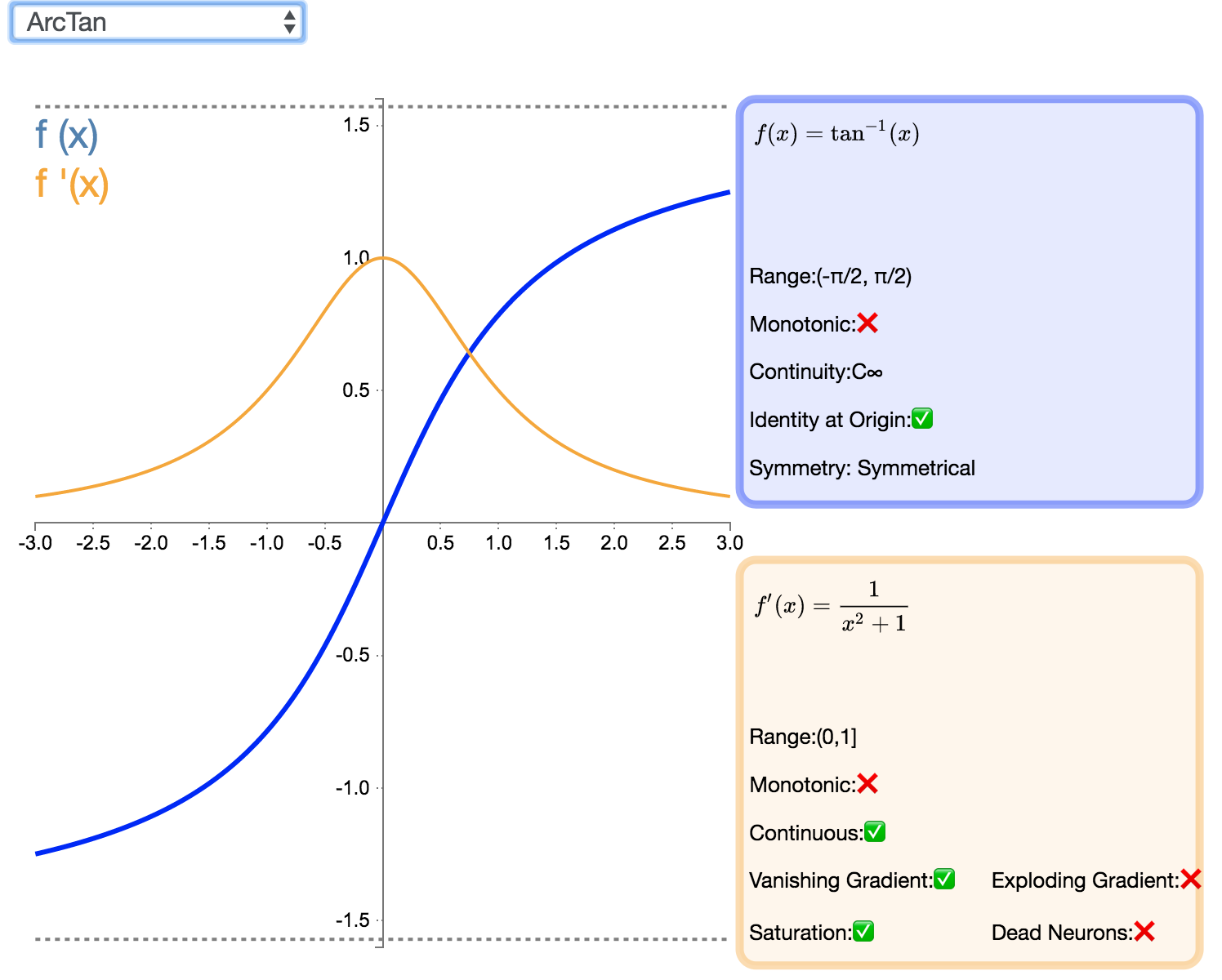 视觉上类似于双曲正切(Tanh)函数,ArcTan 激活函数更加平坦,这让它比其他双曲线更加清晰。在默认情况下,其输出范围在-π/2 和π/2 之间。其导数趋向于零的速度也更慢,这意味着学习的效率更高。但这也意味着,导数的计算比 Tanh 更加昂贵。