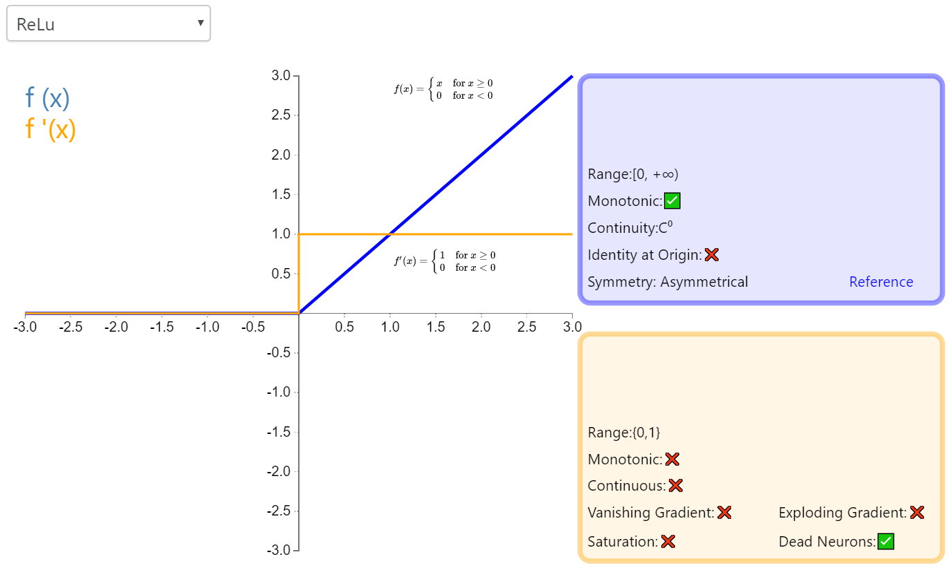 修正线性单元(Rectified linear unit,ReLU)是神经网络中最常用的激活函数。它保留了 step 函数的生物学启发(只有输入超出阈值时神经元才激活),不过当输入为正的时候,导数不为零,从而允许基于梯度的学习(尽管在 x=0 的时候,导数是未定义的)。使用这个函数能使计算变得很快,因为无论是函数还是其导数都不包含复杂的数学运算。然而,当输入为负值的时候,ReLU 的学习速度可能会变得很慢,甚至使神经元直接无效,因为此时输入小于零而梯度为零,从而其权重无法得到更新,在剩下的训练过程中会一直保持静默。