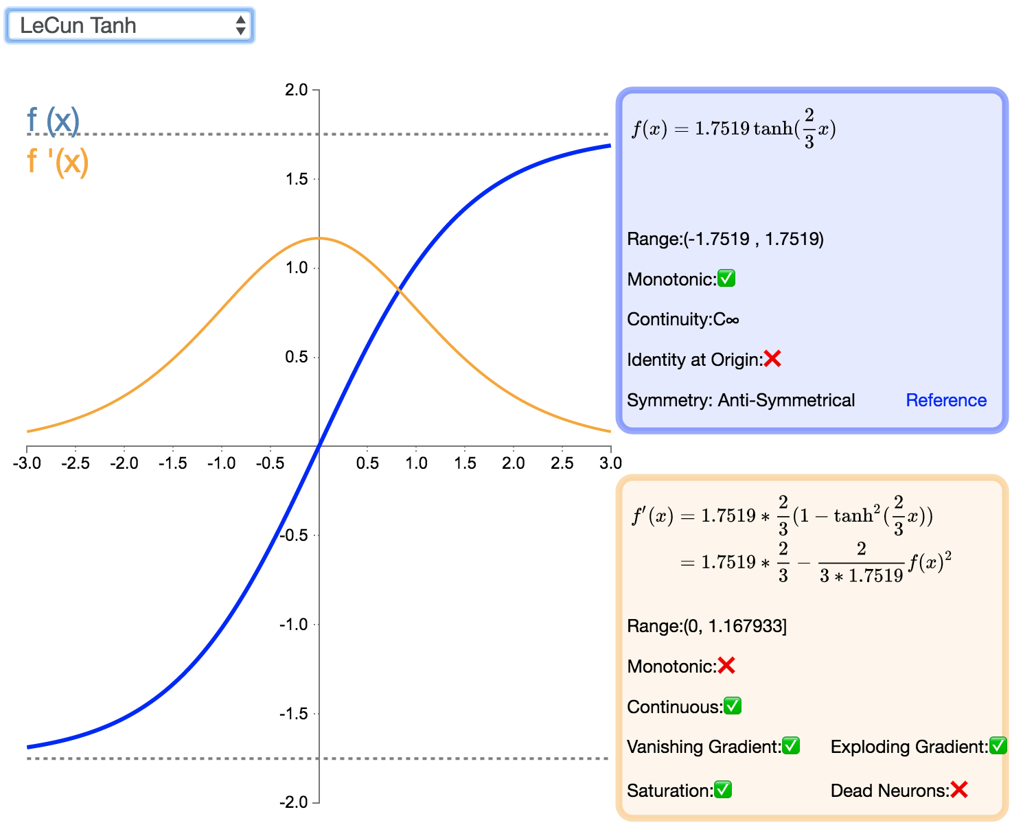 LeCun Tanh(也被称作 Scaled Tanh)是 Tanh 激活函数的扩展版本。它具有以下几个可以改善学习的属性:f(± 1) = ±1;二阶导数在 x=1 最大化;且有效增益接近 1。