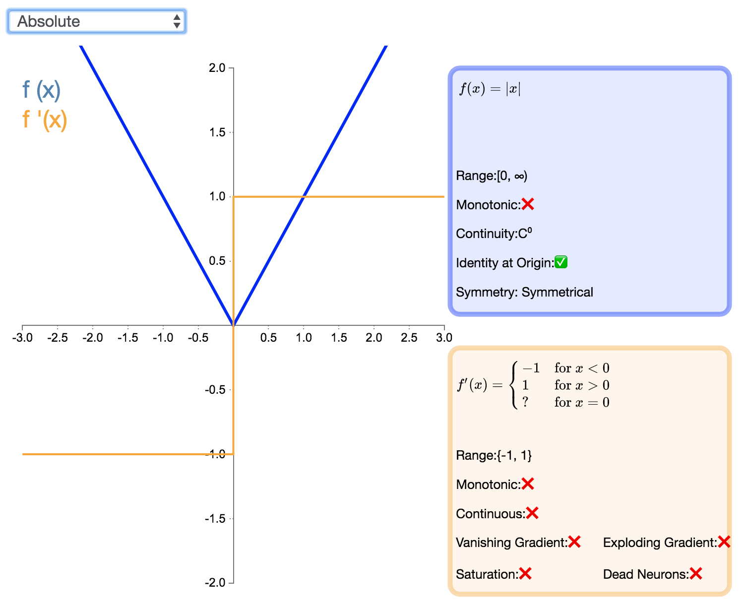 顾名思义,绝对值(Absolute)激活函数返回输入的绝对值。该函数的导数除了零点外处处有定义,且导数的量值处处为 1。这种激活函数一定不会出现梯度爆炸或消失的情况。