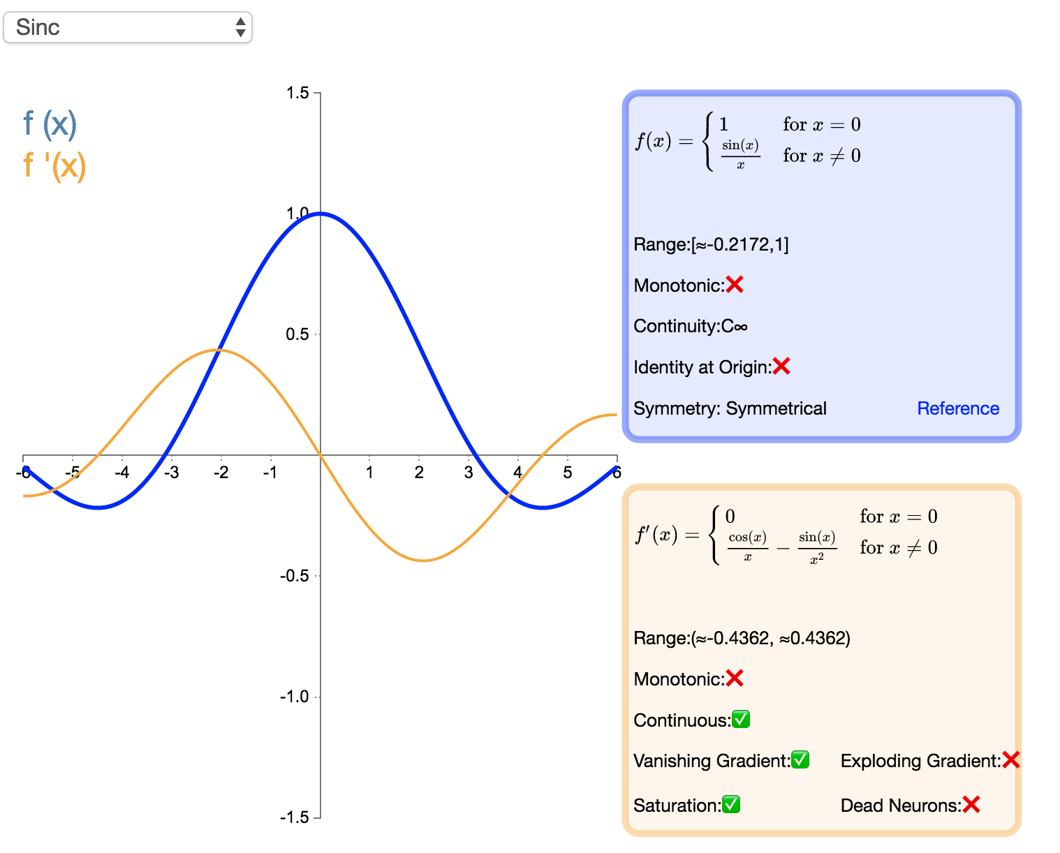 Sinc 函数(全称是 Cardinal Sine)在信号处理中尤为重要,因为它表征了矩形函数的傅立叶变换(Fourier transform)。作为一种激活函数,它的优势在于处处可微和对称的特性,不过它比较容易产生梯度消失的问题。