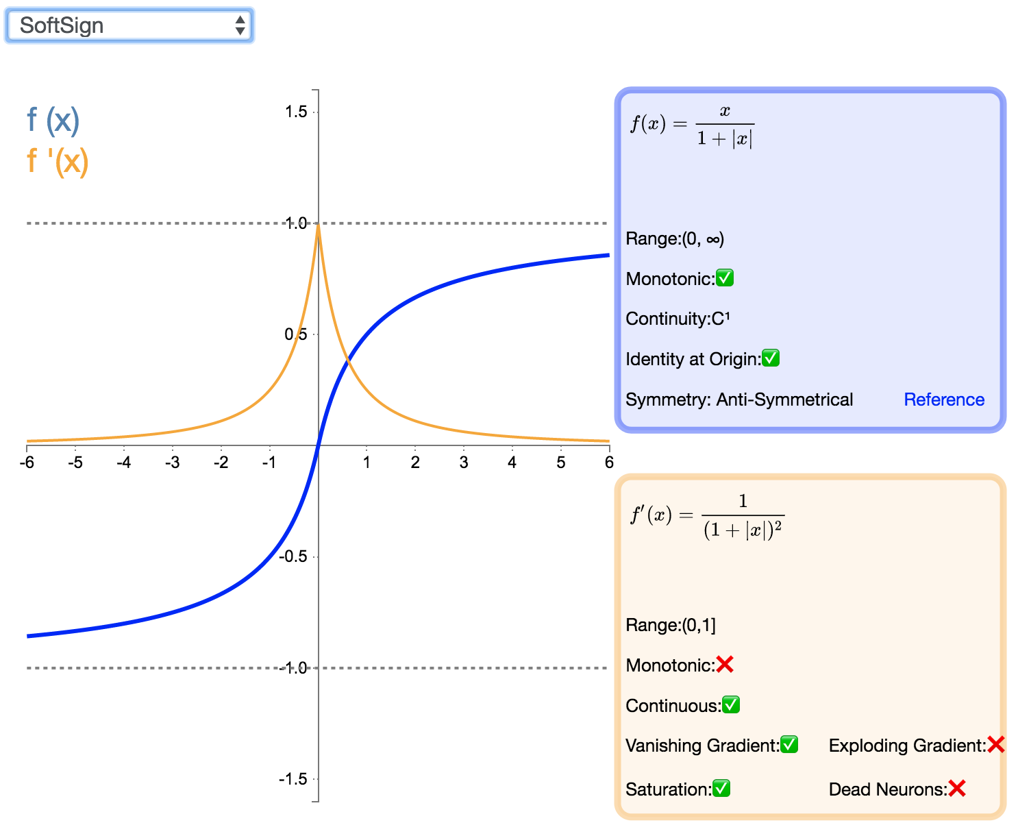 Softsign 是 Tanh 激活函数的另一个替代选择。就像 Tanh 一样,Softsign 是反对称、去中心、可微分,并返回-1 和 1 之间的值。其更平坦的曲线与更慢的下降导数表明它可以更高效地学习。另一方面,导数的计算比 Tanh 更麻烦。