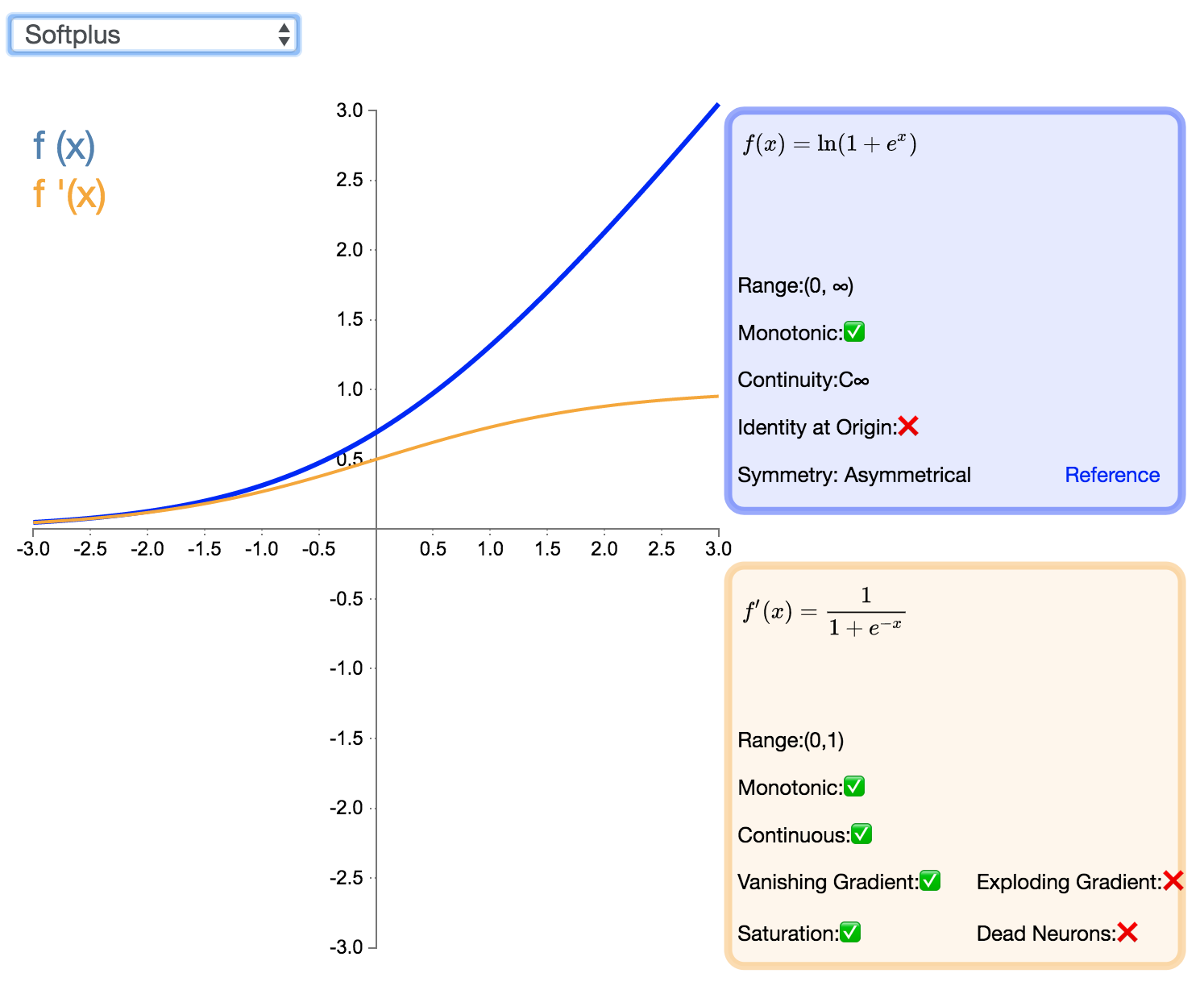 作为 ReLU 的一个不错的替代选择,SoftPlus 能够返回任何大于 0 的值。与 ReLU 不同,SoftPlus 的导数是连续的、非零的,无处不在,从而防止出现静默神经元。然而,SoftPlus 另一个不同于 ReLU 的地方在于其不对称性,不以零为中心,这兴许会妨碍学习。此外,由于导数常常小于 1,也可能出现梯度消失的问题。