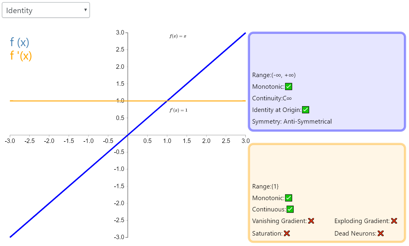 通过激活函数 Identity,节点的输入等于输出。它完美适合于潜在行为是线性(与线性回归相似)的任务。当存在非线性,单独使用该激活函数是不够的,但它依然可以在最终输出节点上作为激活函数用于回归任务。