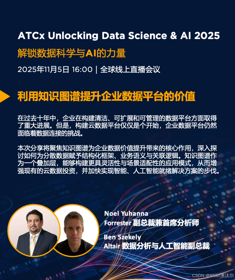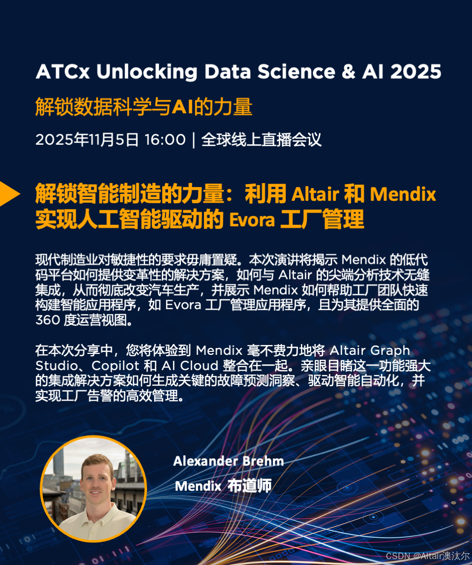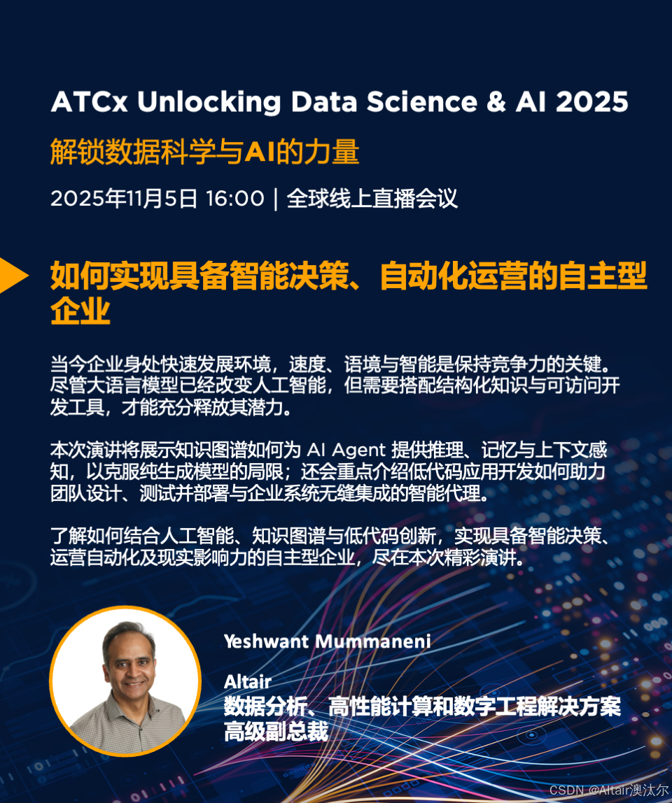 2025年11月5日,Altair 将携手行业领袖、技术专家和教育工作者,带来一场聚焦数据科学与 AI 话题的技术盛会,共同探讨领先的数据科学与 AI解决方案如何在学术界和各行各业推动创新。