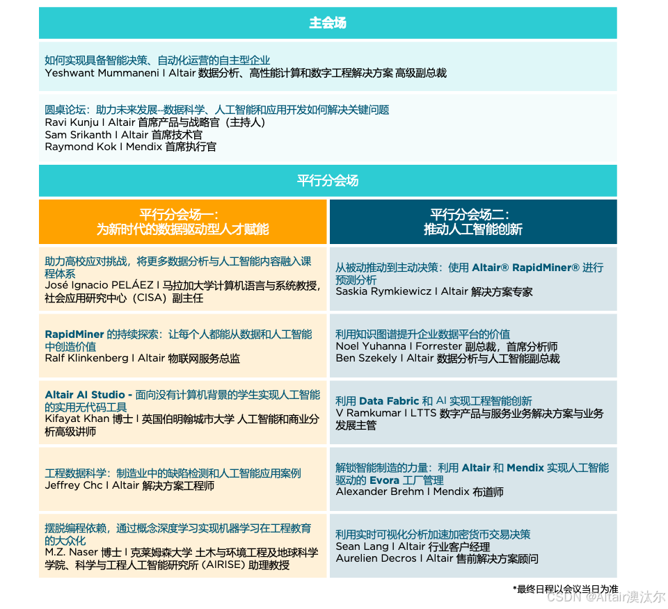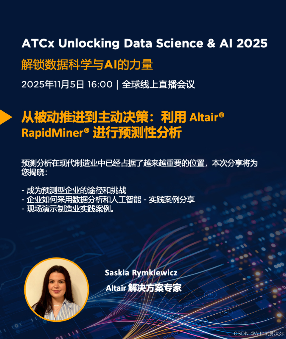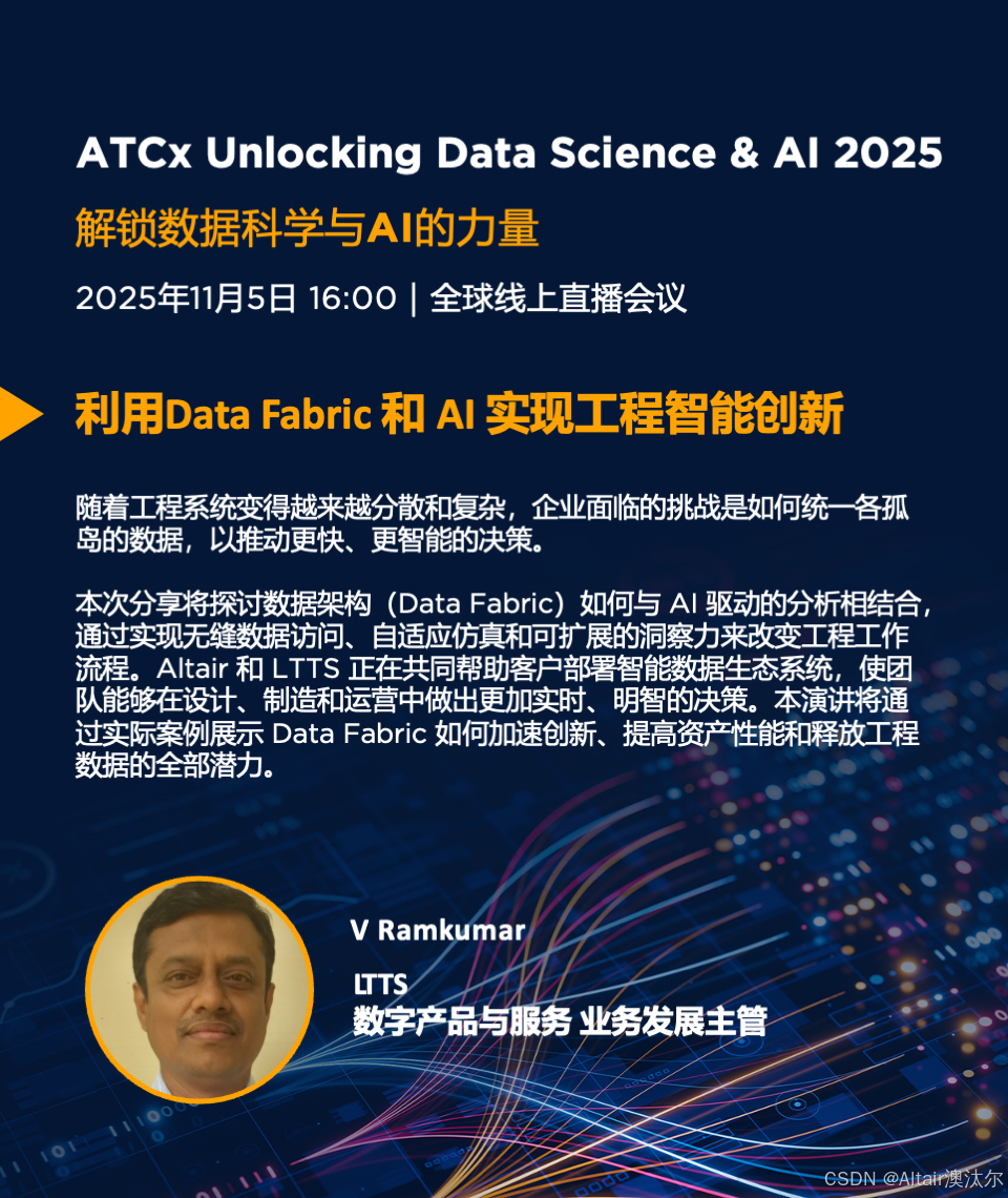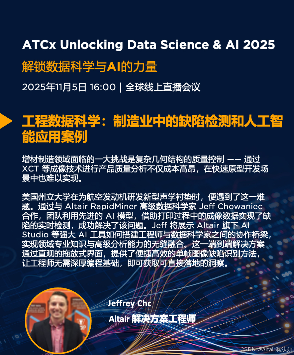 2025年11月5日,Altair 将携手行业领袖、技术专家和教育工作者,带来一场聚焦数据科学与 AI 话题的技术盛会,共同探讨领先的数据科学与 AI解决方案如何在学术界和各行各业推动创新。