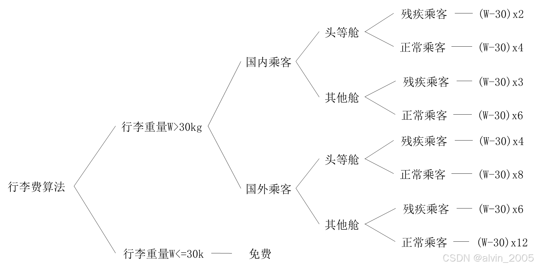 图18给出了根据乘客的不同情况确定如何收取托运行李费用的判定表,通常一张判定表由四部分组成,左上部分列出所有条件;右上部分是表示各种条件组合的一个矩阵;左下部分是所有可能做的动作;右下部分是与每种条件组合相对应的执行动作。