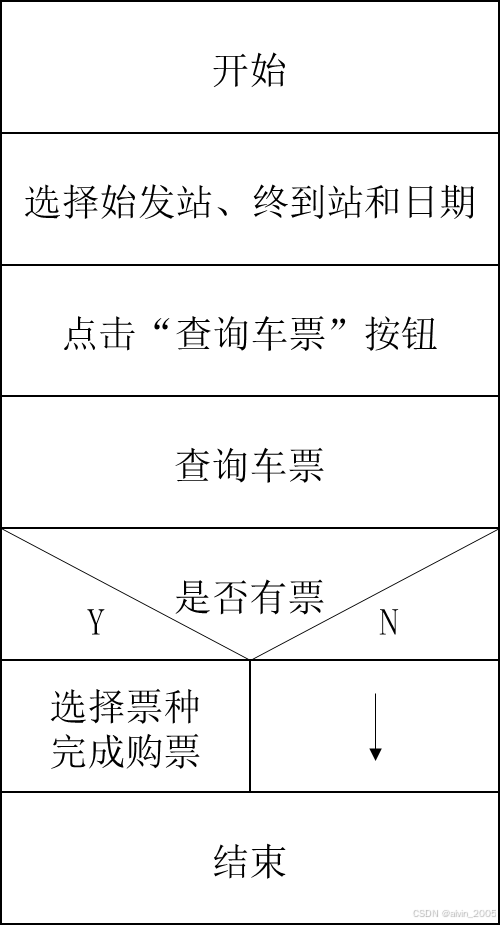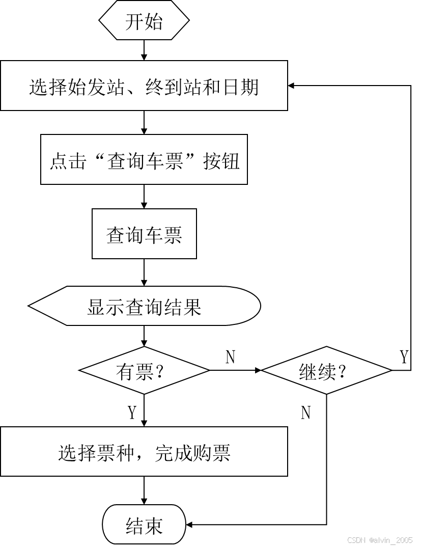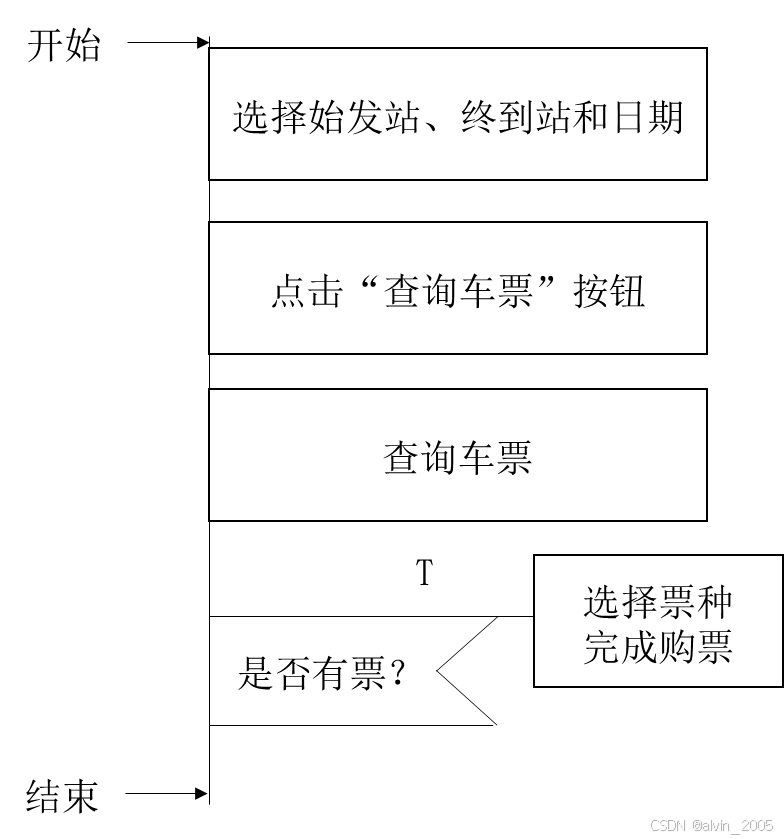 以“铁路12306”APP中旅客购票流程为例,旅客进入APP后,首先选择始发站、终到站和日期,然后点击“查询车票”按钮,系统显示查询结果,如果有票的话,旅客可以点击相应的票种完成购票操作,如果没有票,旅客可选择继续查询或结束购票。针对上述描述,我们就可以绘制下图所示的流程图: