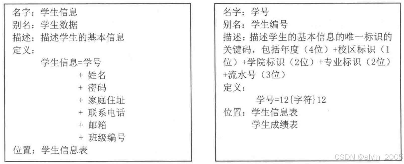 另一种方式,是采用表格的方式,对数据流包含的各个数据项加以说明。表1给出了图6所示“学生信息”对应的数据字典。