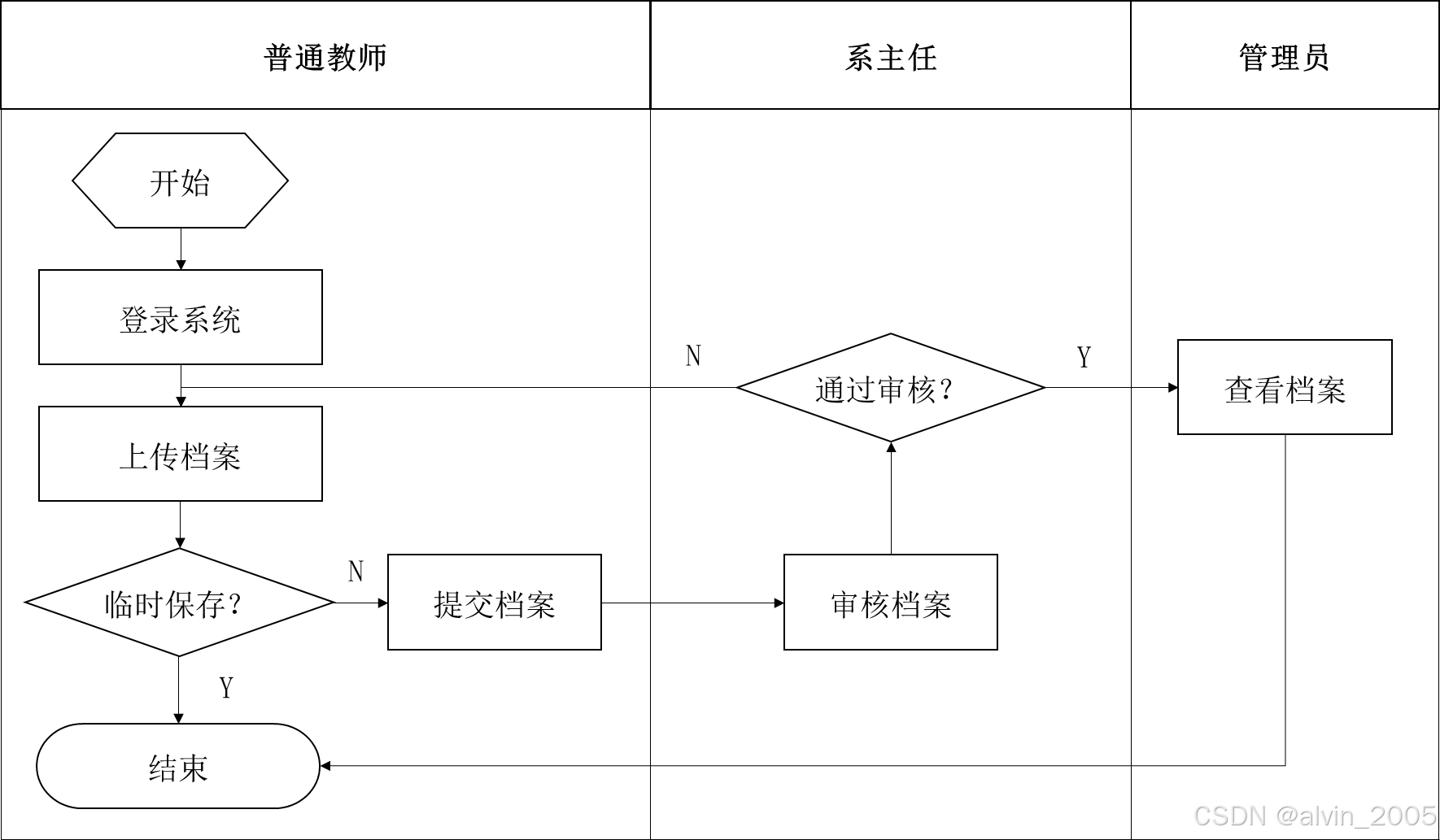 为了表达不同角色之间的协同配合过程,更多时候,我们会绘制带有角色泳道的流程图(即泳道图)来描述角色之间的交互过程。 图13给出了档案管理系统中档案管理的操作流程泳道图。