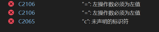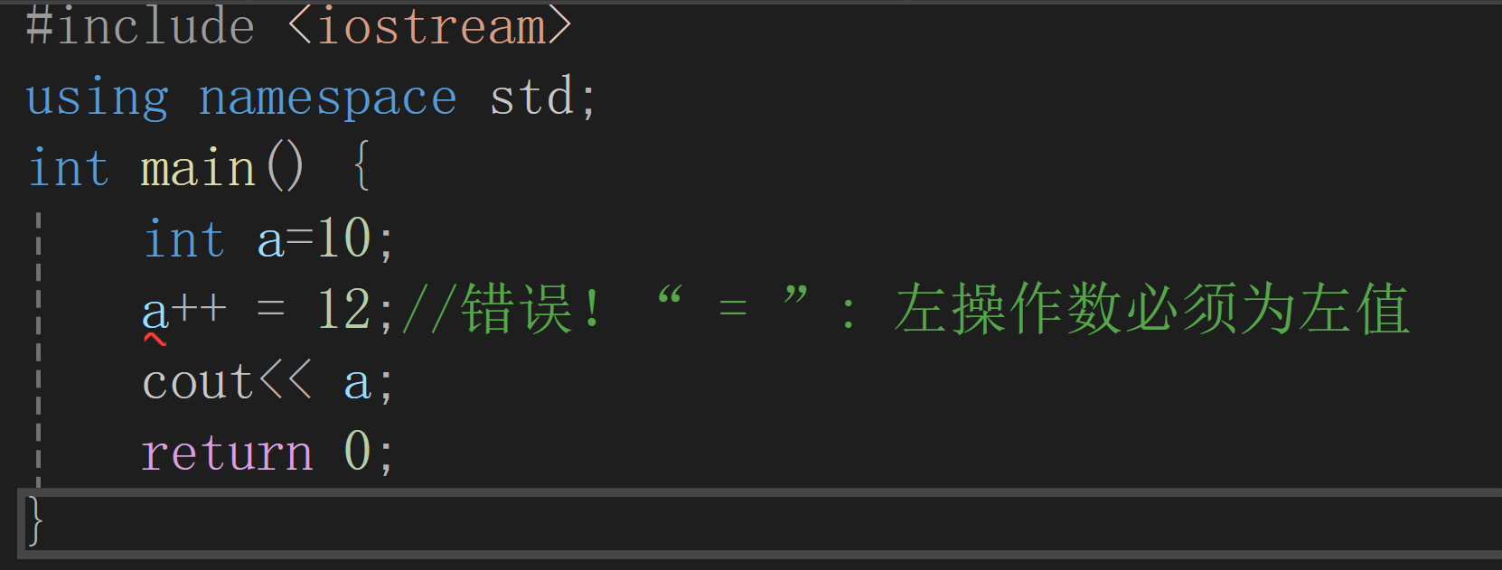需要注意的是,同为自增(自减理同)运算符,前缀++可作为等式左值而后缀不可,因为其在CPU的实现不同,所返回的值不同