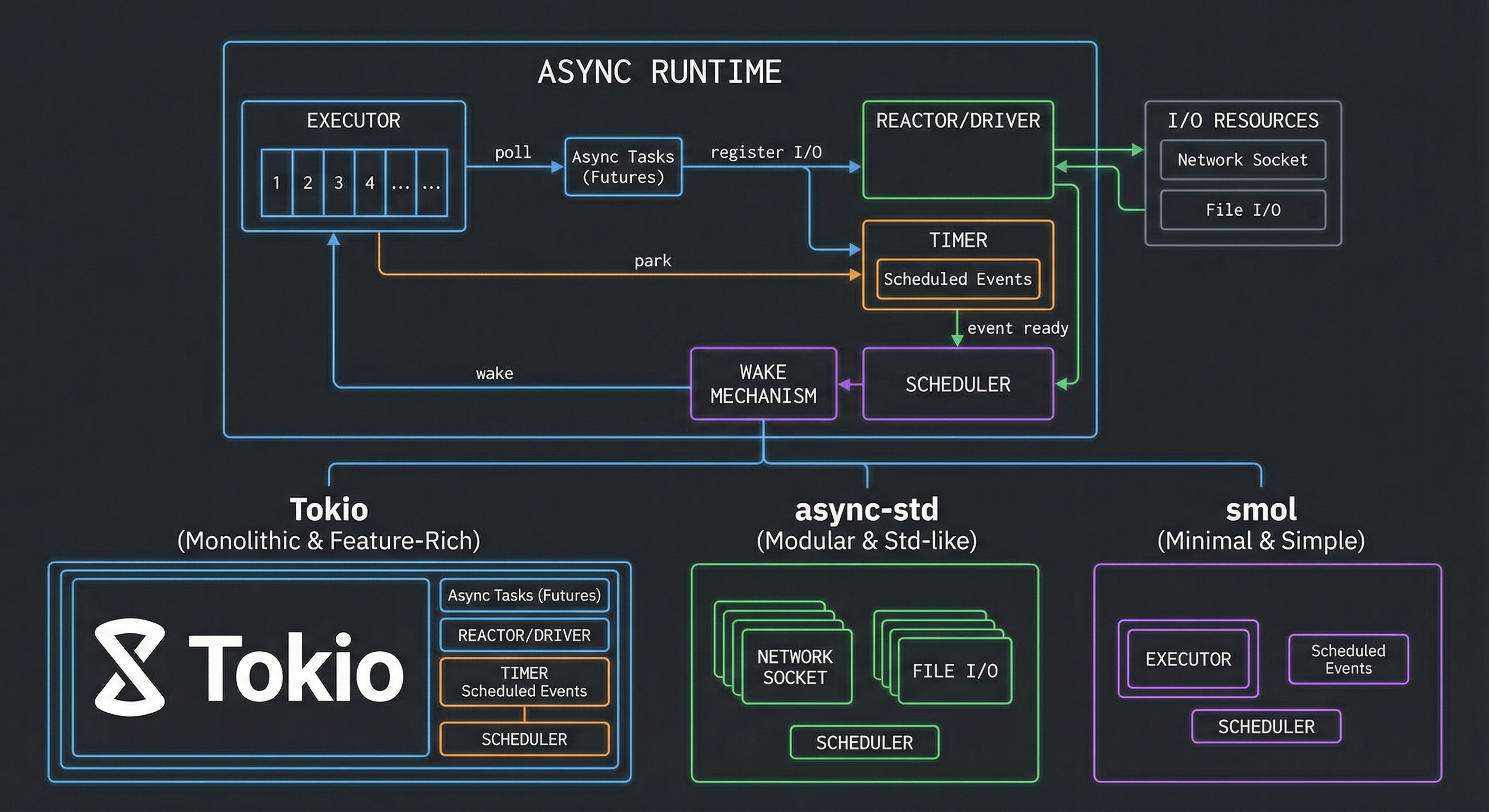 | 内部实现 | work-stealing + reactor | smol 内核 | 模块化组件 |