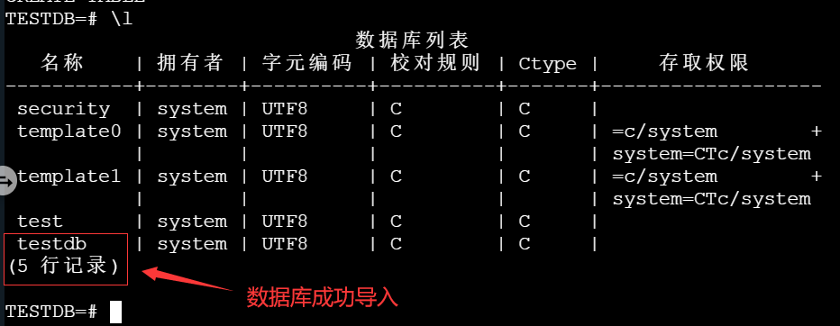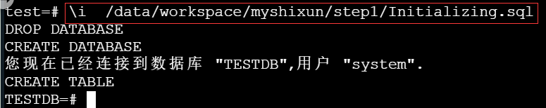 本实践项目是在上一个的基础上完成的,所以首先我们需要导入建好的TESTDB数据库。通过导入sql文件的方式加载数据库,格式为:\i sql文件路径。如下: