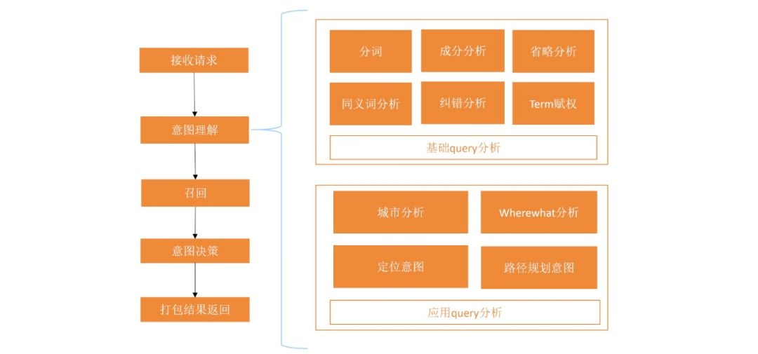 地图搜索的query分析不仅包括通用搜索下的分词,成分分析,同义词,纠错等通用NLP技术,还包括城市分析,wherewhat分析,路径规划分析等特定的意图理解方式。