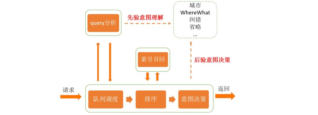 类似于通用检索的架构,地图的检索架构包括query分析,召回,排序三个主要部分。先验的,用户的输入信息可以理解为多种意图的表达,同时下发请求尝试获取检索结果。后验的,拿到每种意图的检索结果时,进行综合判断,选择效果最好的那个。