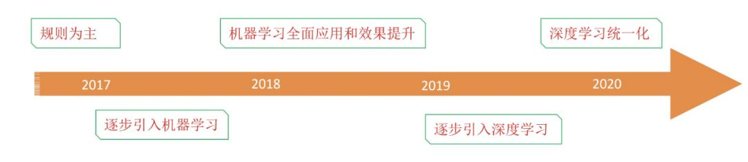 在地里文本处理上整体的技术演进经历了规则为主,到逐步引入机器学习,到机器学习全面应用的过程。由于搜索模块是一个高并发的线上服务,对于深度模型的引入有比较苛刻的条件,但随着性能问题逐渐被解决,我们从各个子方向逐步引入深度学习的技术,进行新一轮的效果提升。