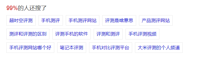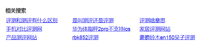 当你在各搜索引擎输入评测二字时,看到的相关搜索通常是这样的: