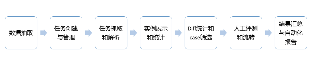 评测工具是评测效率和质量的保证。核心功能包括,数据仓库、任务管理、任务的抓取和解析,diff统计和筛选,任务实例的展示、评测、流转,抽样、分配,结果管理、自动化报告。