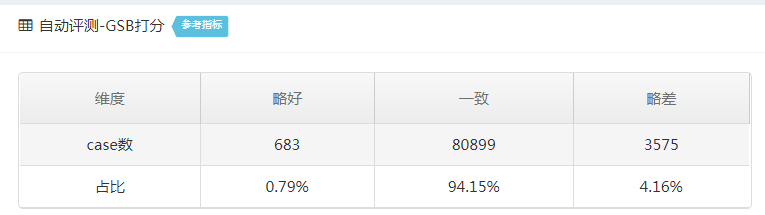 自动打分模型通过学习人工评测的特征,自动给出GSB的评分,统计评分结果,对评测任务的效果进行初步判定。目前可以成为辅助判断的参考手段。