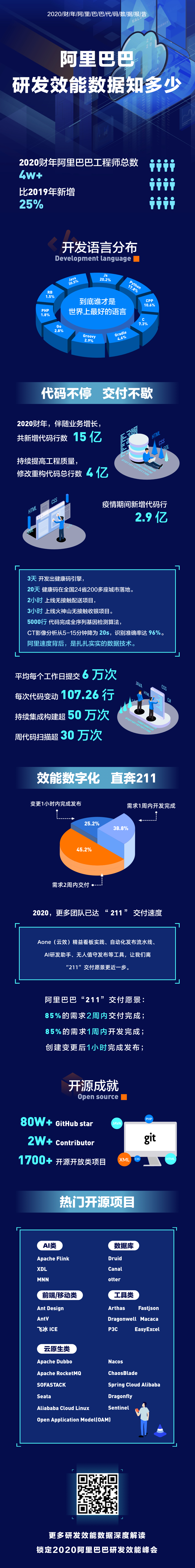 2020 年 3 月阿里云云效平台发布了阿里内部 4 万开发者的研发效能数据报,数据显示阿里代码量和交付表现一路飙升,2020 财年代码行数共新增 15 亿,修改重构代码总行数 4 亿,疫情期间新增代码行 2.9 亿;3 天开发出健康码引擎、2 小时上线无接触配送项目,3 小时上线火神山无接触收银项目、CT 影像分析从 5-15 分钟降为 20s,识别准确率达 96%……,这阿里速度背后,是研发效能的突破和精进。