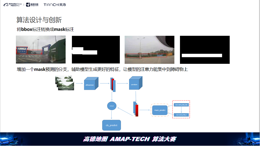在本次比赛复赛中,对于封闭类给出了障碍物的bbox标注,这里我们将bbox标注转换成了mask标注,在生成序列特征的时候,添加了一个mask预测的分支来辅助模型生成更好的特征,使模型能关注到障碍物的特征。