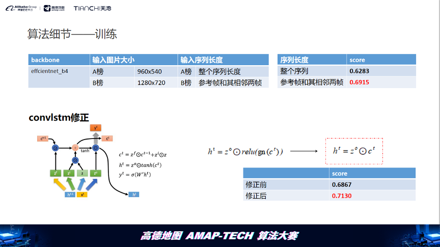 另外,我们对convlstm的实现做了一个小修正,在原始lstm的实现里lstm内部存储的信息ct会经过一个tanh的激活和输出gate相乘作为最后的输出,对于图像,我们用了relu+group norm替换了tanh,但是在group norm计算时,由于要减去一个均值,所以会有一半特征的值是小于0的,然后使用relu就会把这部分特征丢弃掉,这是很不利于后面的mask预测的,所以我们最后在convlstm的实现时去掉了这里的激活函数