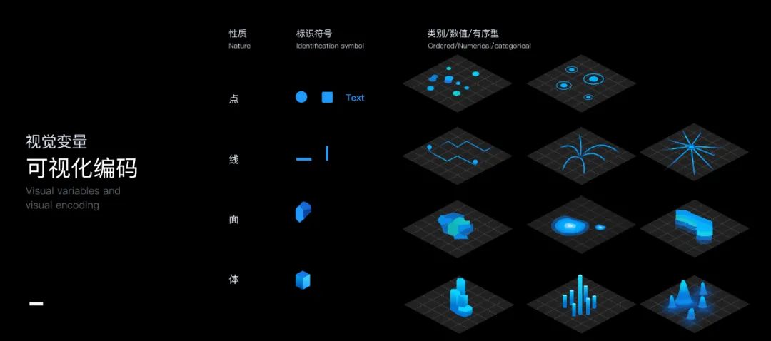 在实现可视化映射时,LOCA 采用图形易变量的思路,定义了视觉变量的种类:形状、尺寸、方向、颜色,将数据点映射到图形时,基于数据的类别、顺序和数值特性,匹配合适的视觉图形。如图所示,LOCA 所使用的视觉变量及可视化编码。