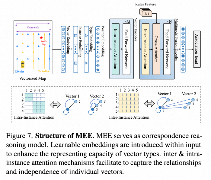 其中 MEE 模型专门用于对矢量地图进行特征编码,将每个矢量点进行 tokenize,使用 learnable query 配合 Intra & Inter Instance Attention 进行矢量特征的聚合,融合后每个 query 对应一条矢量的特征信息。通过 CrossAttention 进行矢量特征和交通规则特征的融合,使用融合后的 feature token 进行分类以判定中心线与规则的关联关系。