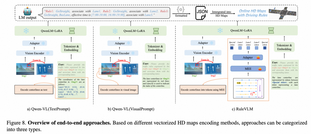 端到端方法在多模态大模型基础上进行了探索,以 Qwen-VL-Chat 7B 作为基础模型,如图所示分别以不同方式进行了LoRA SFT,令模型生成结构化文本形式的交通规则: