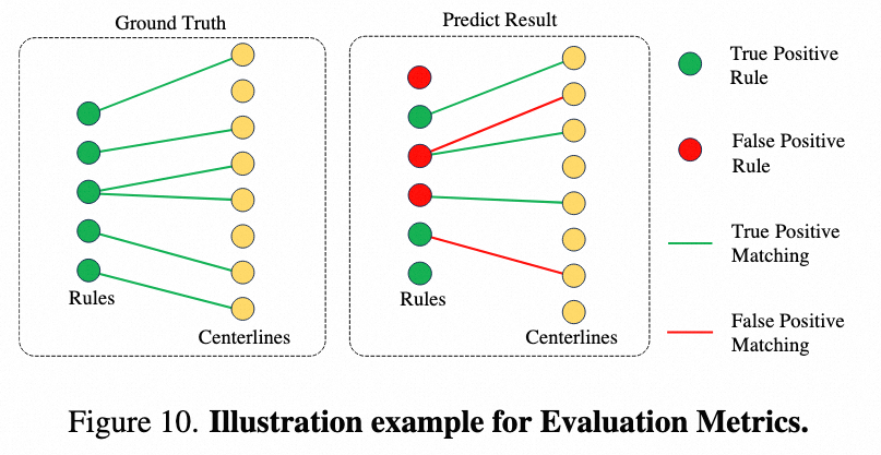 总体任务可以视为一个二分图匹配任务,如上图所示。其中抽取车道级交通规则视作对于图中 Rule Node 的预测,Rule 和 Centerline 之间的关联关系可以视作图中 Edge 的预测。评测时两个子任务分别关注于 Rule Node 和 Edge 的 Precision 和 Recall,总体任务关注于最小子图(由一个Rule Node、一个 Centerline Node 和 一条 Edge 组成)的 Precision 和 Recall