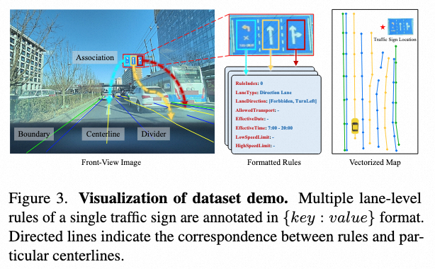 因此,高德地图联合西安交大提出了 Driving by the Rules 的概念。提出了“将交通标志中的车道级交通规则整合至在线构建的高精地图中”这一新的具有挑战的任务,并提供一个 Benchmark 供研究人员展开相关研究。