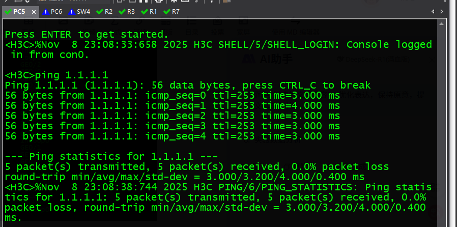 [R3-acl-ipv4-adv-3000]rule 5 deny ip source 40.0.0.0 0.0.0.255 destination 1.1.1.0 0.0.0.255 ---- 拒绝PC6网段访问R1的LoopBack网段