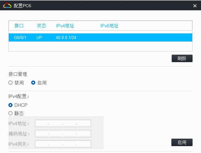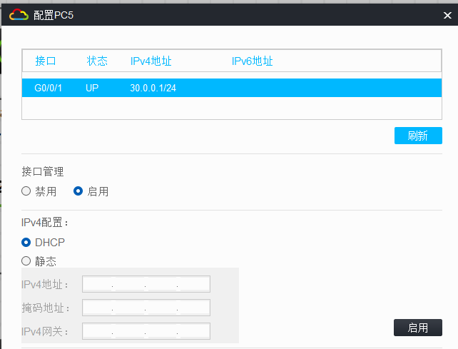 鼠标右击拓扑中的 PC 设备,在显示的选项中点击配置选项。注意:启用接口管理,启用 IPv4 的动态获取(DHCP),再点击上方的刷新!
