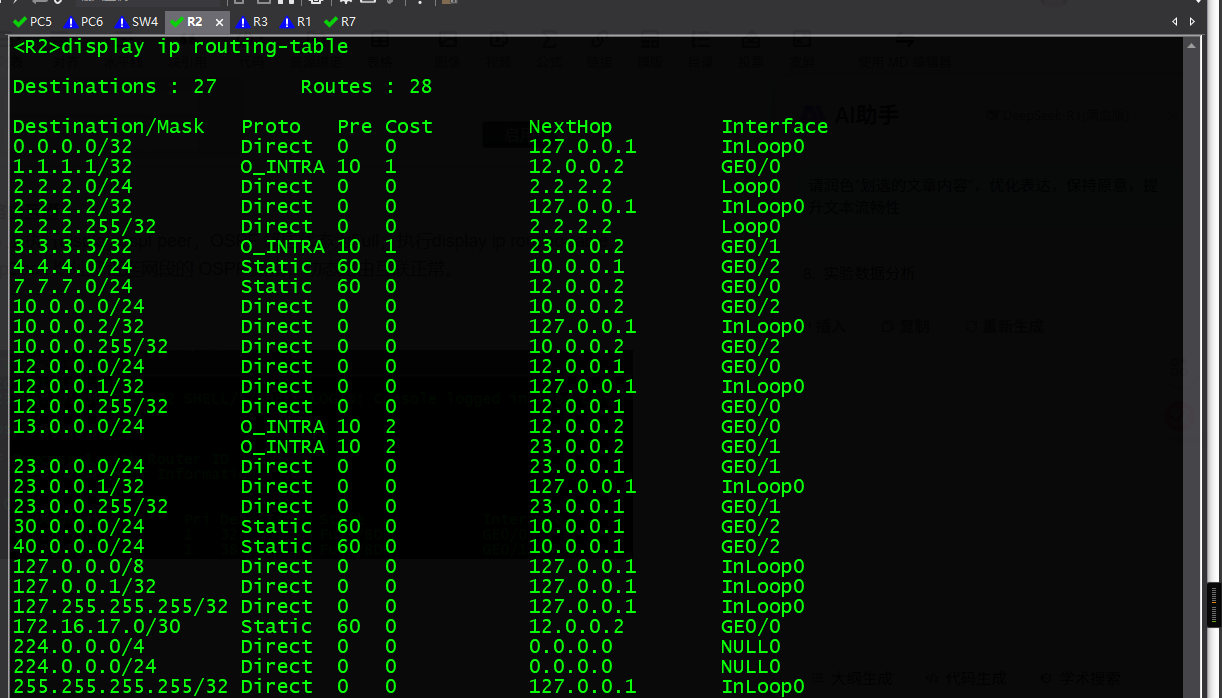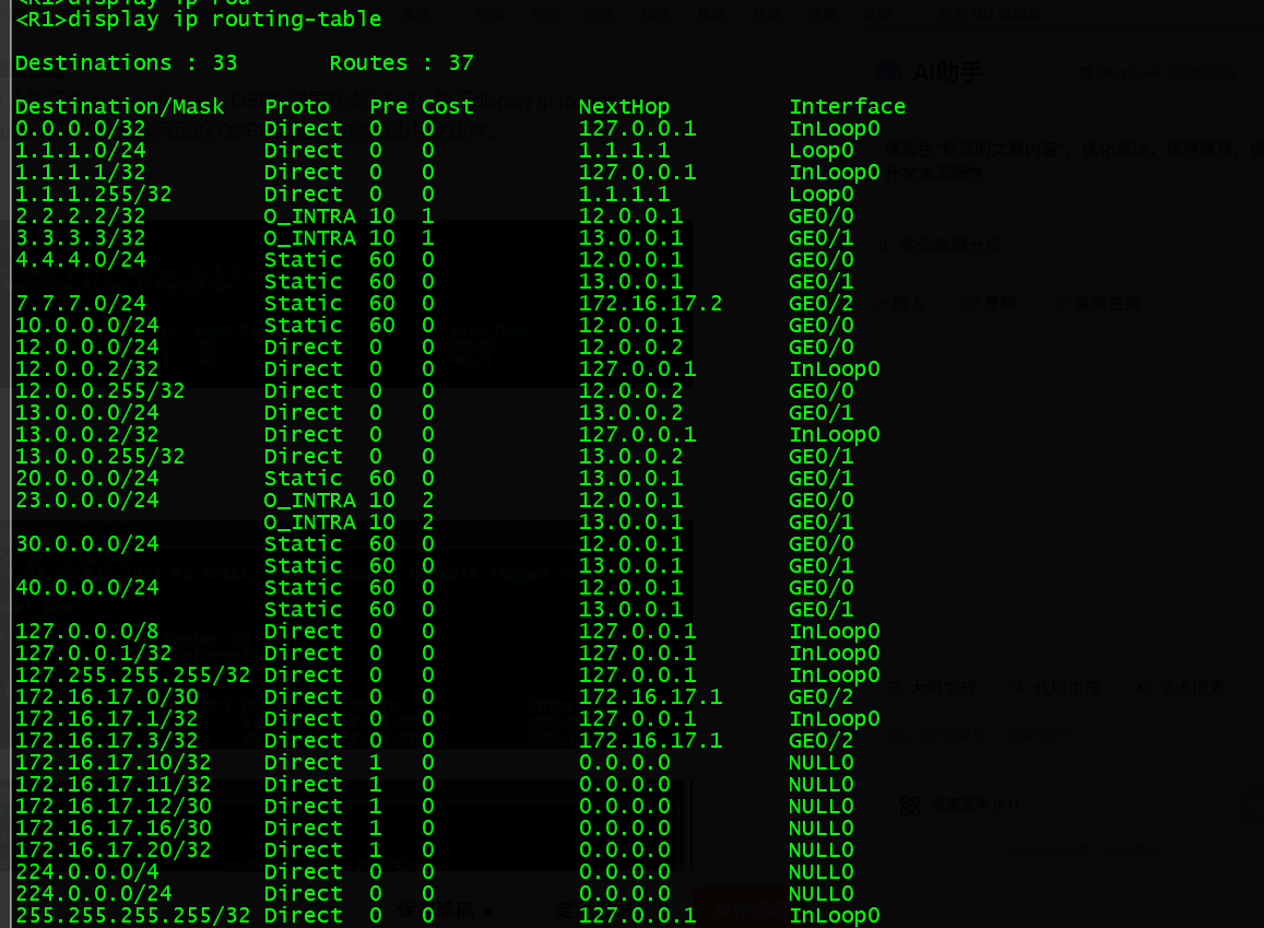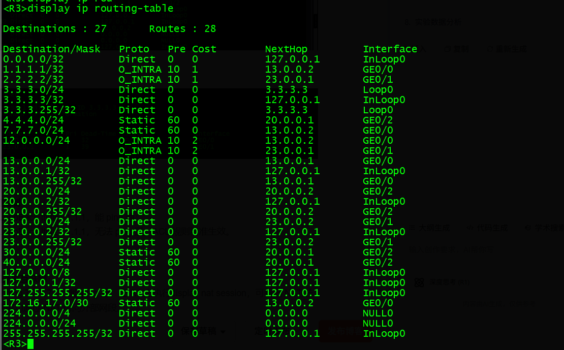 在 R1、R2、R3 上执行display ospf peer,OSPF 邻居状态为Full;执行display ip routing-table,存在到对方 LoopBack 地址及直连网段的 OSPF 路由,动态路由互联正常。