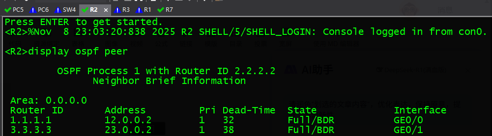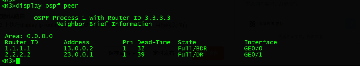 [R3-ospf-1]area 0 ---- 加入OSPF区域0
