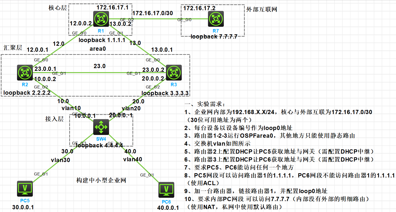 1、企业网内部包含 10.0.0.0/24、20.0.0.0/24、30.0.0.0/24、40.0.0.0/24 等网段,核心与外部互2、联为 172.16.17.0/30(30 位掩码,可用地址两个)。