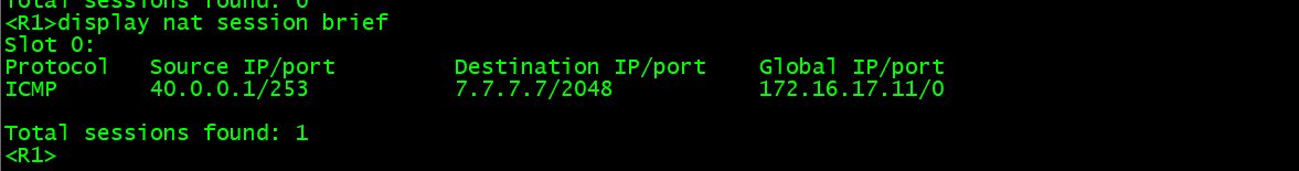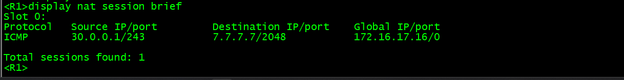 PC5 和 PC6 分别 ping 7.7.7.7,均能 ping 通;在 R1 上执行display nat session,可看到 NAT 转换会话,私网流量成功通过 NAT 访问外部网段。