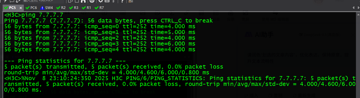 [R1-acl-ipv4-adv-3000]rule 5 permit ip source 40.0.0.0 0.0.0.255 destination 7.7.7.0 0.0.0.255 ---- 允许PC6网段访问7.7.7.0网段