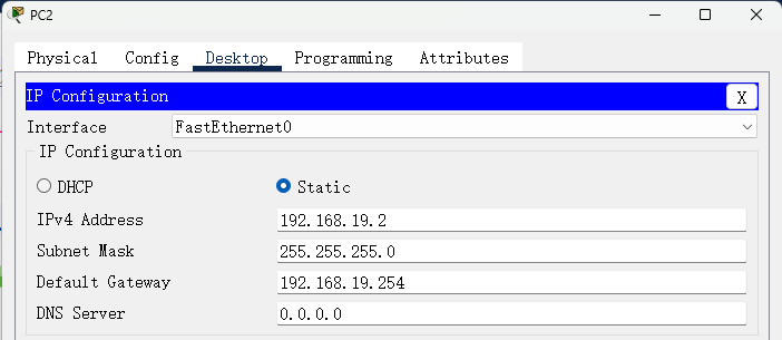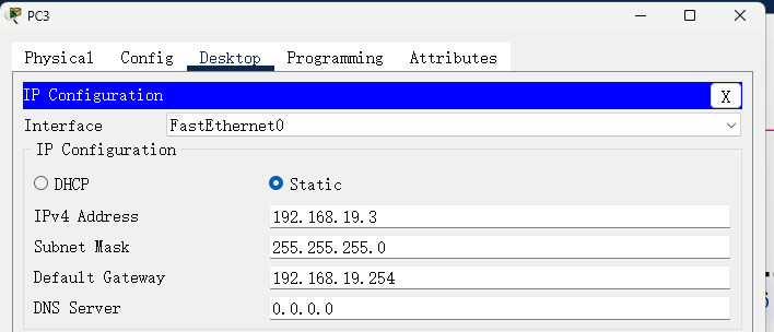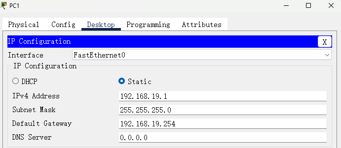 网关:192.168.19.254(R1 的 Gig0/0 接口 IP,指向私网出口)