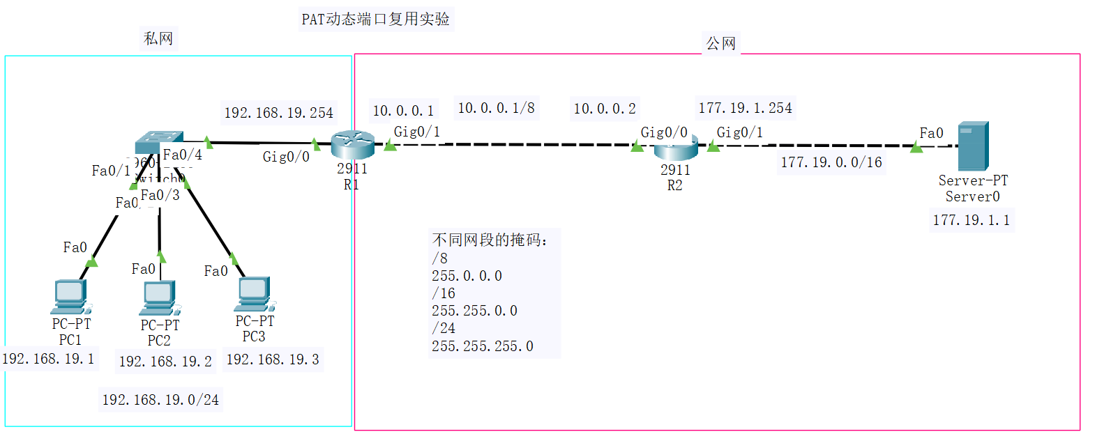 私网网段 192.168.19.0/24(PC1-PC3 所在),互联网段 10.0.0.0/8(R1 与 R2 对接),公网网段 177.19.0.0/16(Server0 所在);