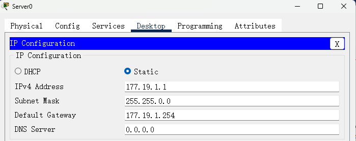 R2 的 Gig0/1 接口与 Server0 的FastEthernet 0/1接口相连(177.19.0.0/16 公网网段)。