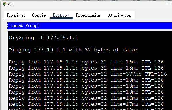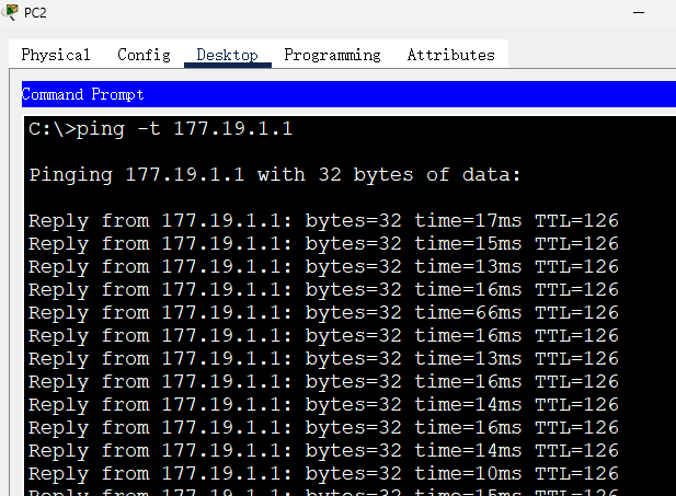 操作:PC1、PC2、PC3 同时 ping -t Server0(177.19.1.1),按 Ctrl+c 可以停止持续 ping。