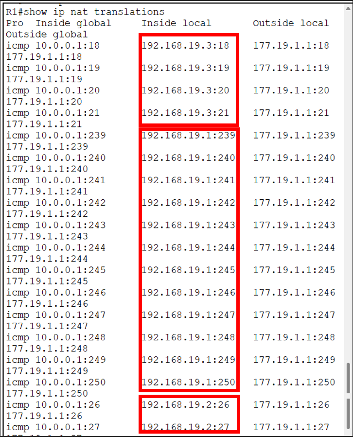 操作:R1 特权模式执行show ip nat translations(查看 PAT 转换表);