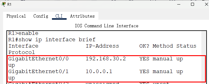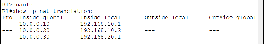 R1(config)#ip nat inside source static 192.168.20.1 10.0.0.30 # 192.168.20.1→10.0.0.30