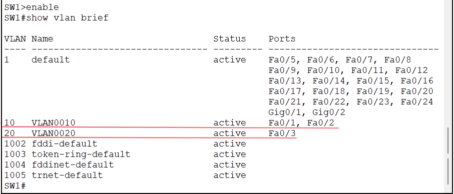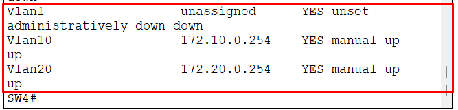 SW1(config-if)#switchport access vlan 20 # 将接口划入VLAN20