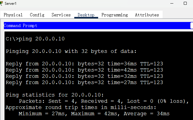 从 Server1 (192.168.10.1) Ping Server4 (172.10.0.1→20.0.0.10)